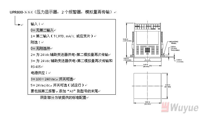特征 ★ 顯示壓力,溫度,或壓差 ★ 附選第二次輸入/輸出,經(jīng)濟有效的單個儀器 ★ 現(xiàn)場觀看或通過附選Modbus RTU遠(yuǎn)程觀看顯示信息 ★ 直觀的棒圖顯示比例值 ★ 兩個報警信號中繼輸出,附選第三個報警中繼輸出 ★ 工藝參數(shù)的模擬量再輸出方便的允許信號傳送到其它裝置 ★ 現(xiàn)場配置或通過附選Modbus RTU遠(yuǎn)程配置 ★ 數(shù)字安全碼防止未授權(quán)使用 ★ 防護等級IP65/NEMA 4X 它可應(yīng)用于苛刻環(huán)境 UPR800是一個緊湊的1/4DIN 加工指示器。UPR800能顯示在可選輸入類型范圍內(nèi)的工程單位。添加一個附選的第二輸入,能在一臺UPR800上同時顯示聚合物熔體壓力和溫度。第二輸入可以是應(yīng)變片用來指示壓差的測量。UPR包括兩個標(biāo)準(zhǔn)的可設(shè)定的報警和附選的第三個報警。明亮的5節(jié)LED顯示值伴有一個有用的35節(jié)棒圖,這個棒圖顯示了設(shè)置范圍內(nèi)的數(shù)值。其它有用的顯示信息包括報警設(shè)置點,峰值和工程單位指示燈。UPR800可無需復(fù)雜的機械跳線輕松地現(xiàn)場設(shè)置或通過附選的Modbus RS-485遠(yuǎn)程編程??墒褂靡粋€附選的24Vdc輸入供電。 UPR800壓力溫度雙測儀表(temperature and pressure dualmeasuring display)